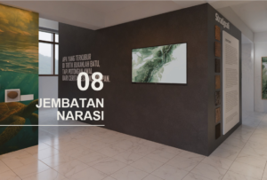 Monitor dan kutipan yang ditampilkan mempertegas peran zona ini sebagai ruang peralihan yang membantu pengunjung memasuki bab cerita berikutnya secara lebih runtut.