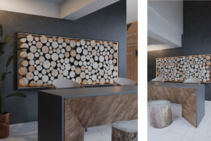 Area resepsionis Museum Tritik dirancang dengan atmosfer hangat dan natural, menonjolkan material kayu sebagai elemen utama. Instalasi potongan batang kayu berbentuk lingkaran-lingkaran beragam ukuran tersusun rapat pada dinding belakang, menciptakan pola organik yang langsung mengingatkan pada karakter Desa Tritik sebagai penghasil kayu jati. Pencahayaan lembut dari plafon mempertegas tekstur dan warna kayu, menghadirkan nuansa tenang, elegan, dan selaras dengan identitas lokal yang ingin dihadirkan museum.