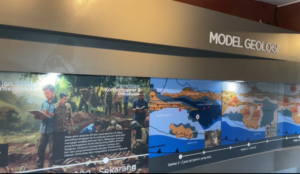Poster dengan nuansa biru digunakan untuk menggambarkan masa ketika Indonesia masih berada di bawah permukaan laut. Visual kehidupan laut di dalamnya membantu pengunjung memahami konteks waktu dan kondisi lingkungan pada periode tersebut, menjadikan zona ini informatif sekaligus imersif
